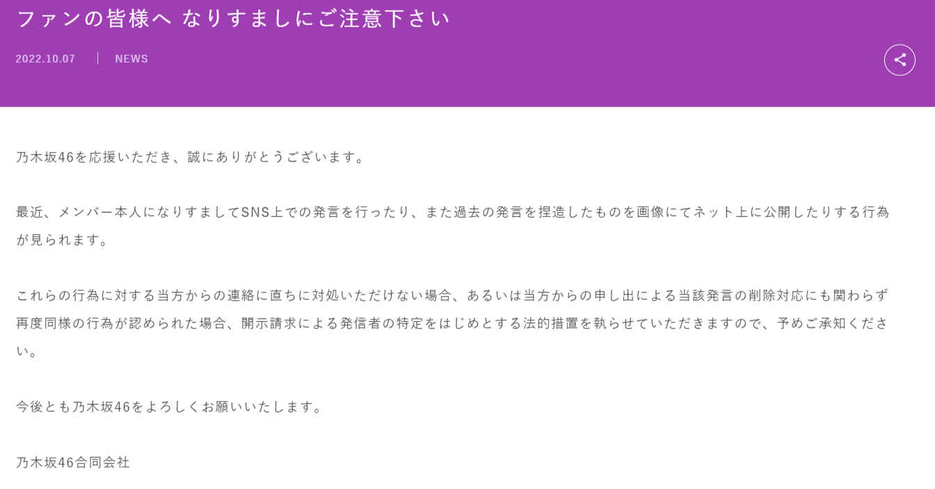 乃木坂46運営ブチギレ「アンチには開示請求による発信者の特定をはじめとする法的措置を取ります」