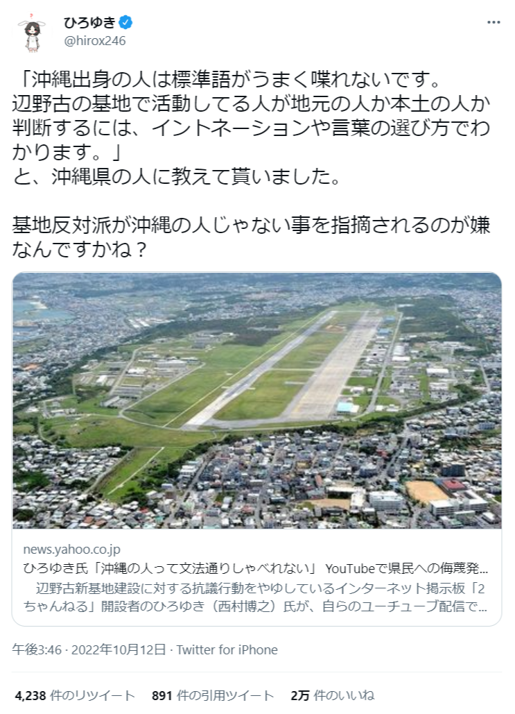 ひろゆき 「『沖縄出身の人は標準語がうまく喋れないです』と、沖縄県の人に教えて貰いました。」