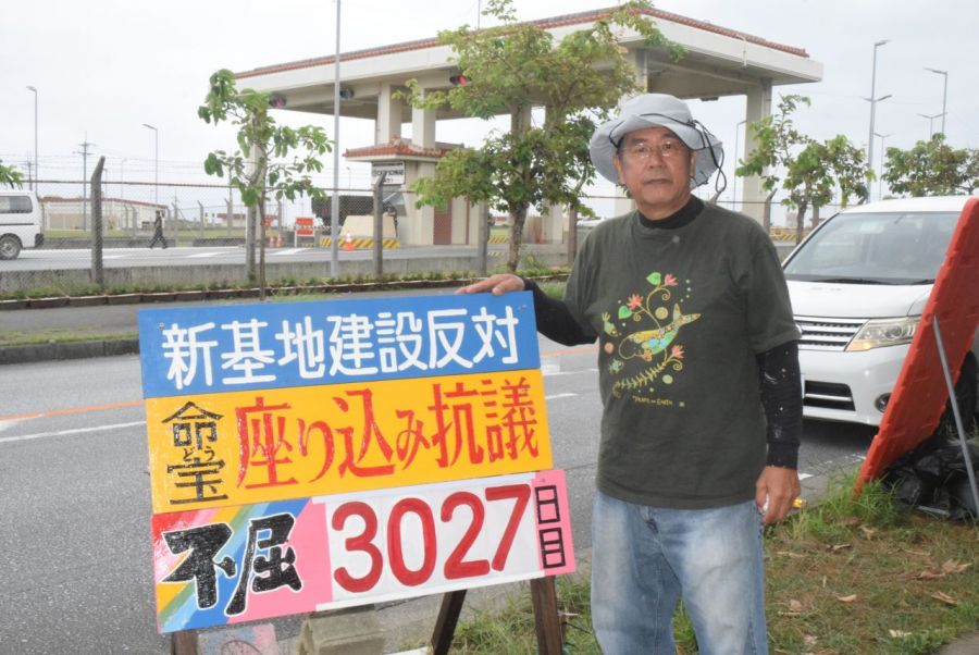 【名護】名護市のキャンプ・シュワブゲート前で抗議行動を続ける市民らが19日午前、座り込みの日数を示す新たな看板を設置した。金城武政さん(65)が9月から制作してきた木製の看板で、「新基地建設反対 座り込み抗議」などの文言が彫刻刀で彫られている。座り込み日数はこの日で「3027日目」となった。