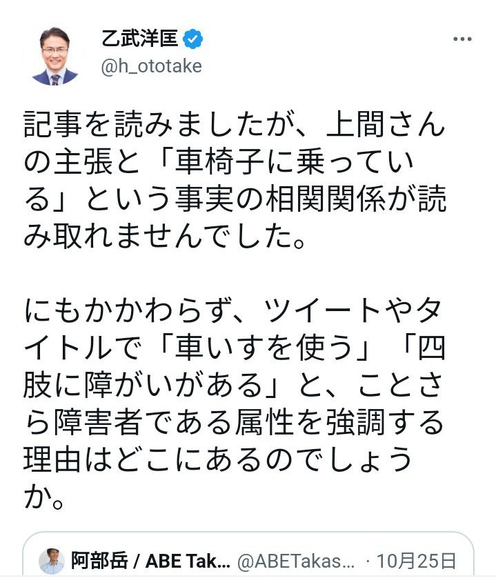 記事を読みましたが、上間さんの主張と「車椅子に乗っている」という事実の相関関係が読み取れませんでした。
