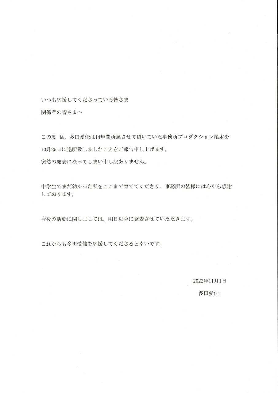 【速報】多田愛佳が事務所を退所!今後については明日以降発表ヘ