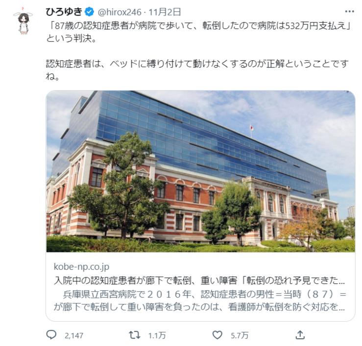 この訴訟の判決が1日、神戸地裁であり、高松宏之裁判長は「転倒する恐れが高いことは予見できた」などとして、約532万円の支払いを命じたとする神戸新聞の記事を貼り付け、「『87歳の認知症患者が病院で歩いて、転倒したので病院は532万円支払え』という判決。認知症患者は、ベッドに縛り付けて動けなくするのが正解ということですね」とつづった。