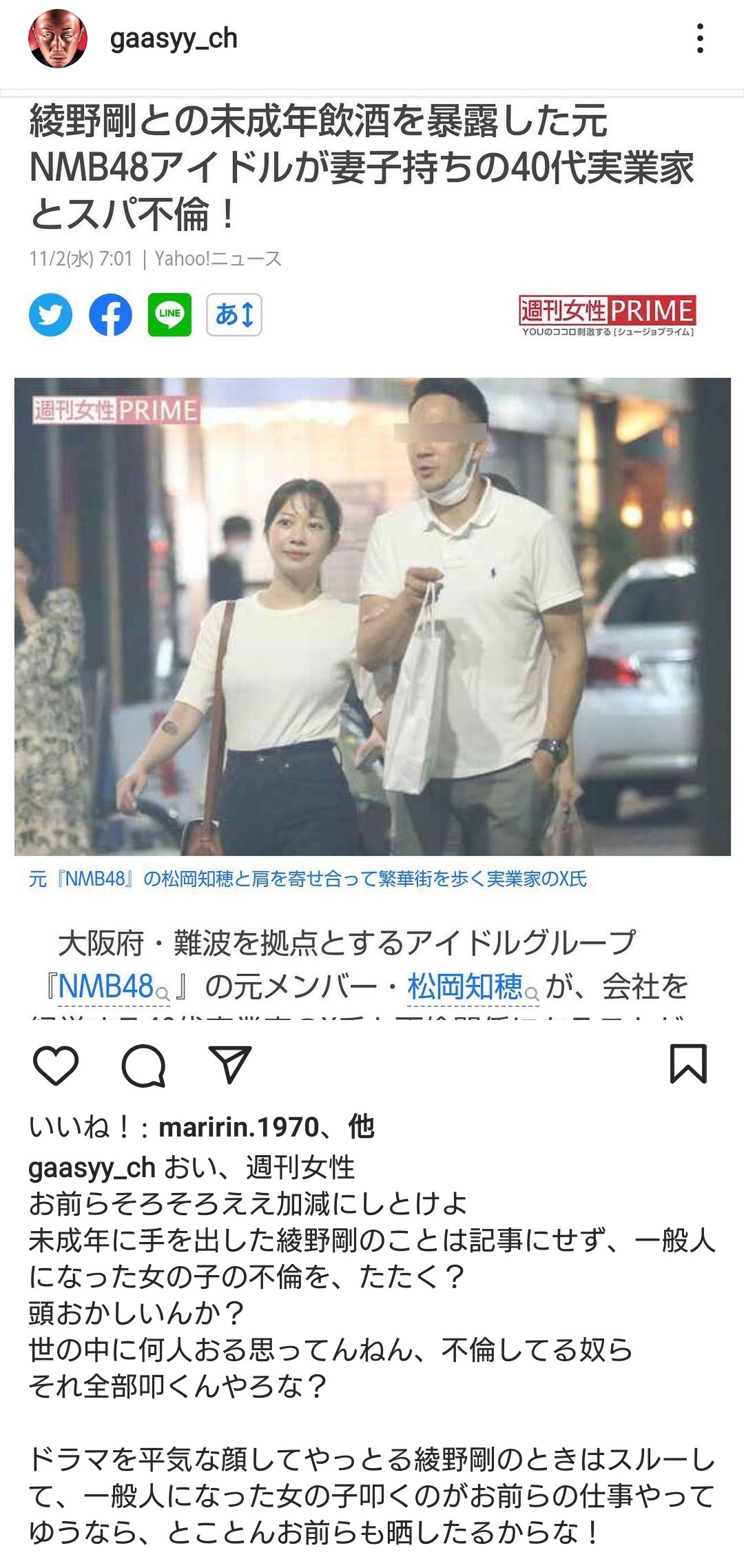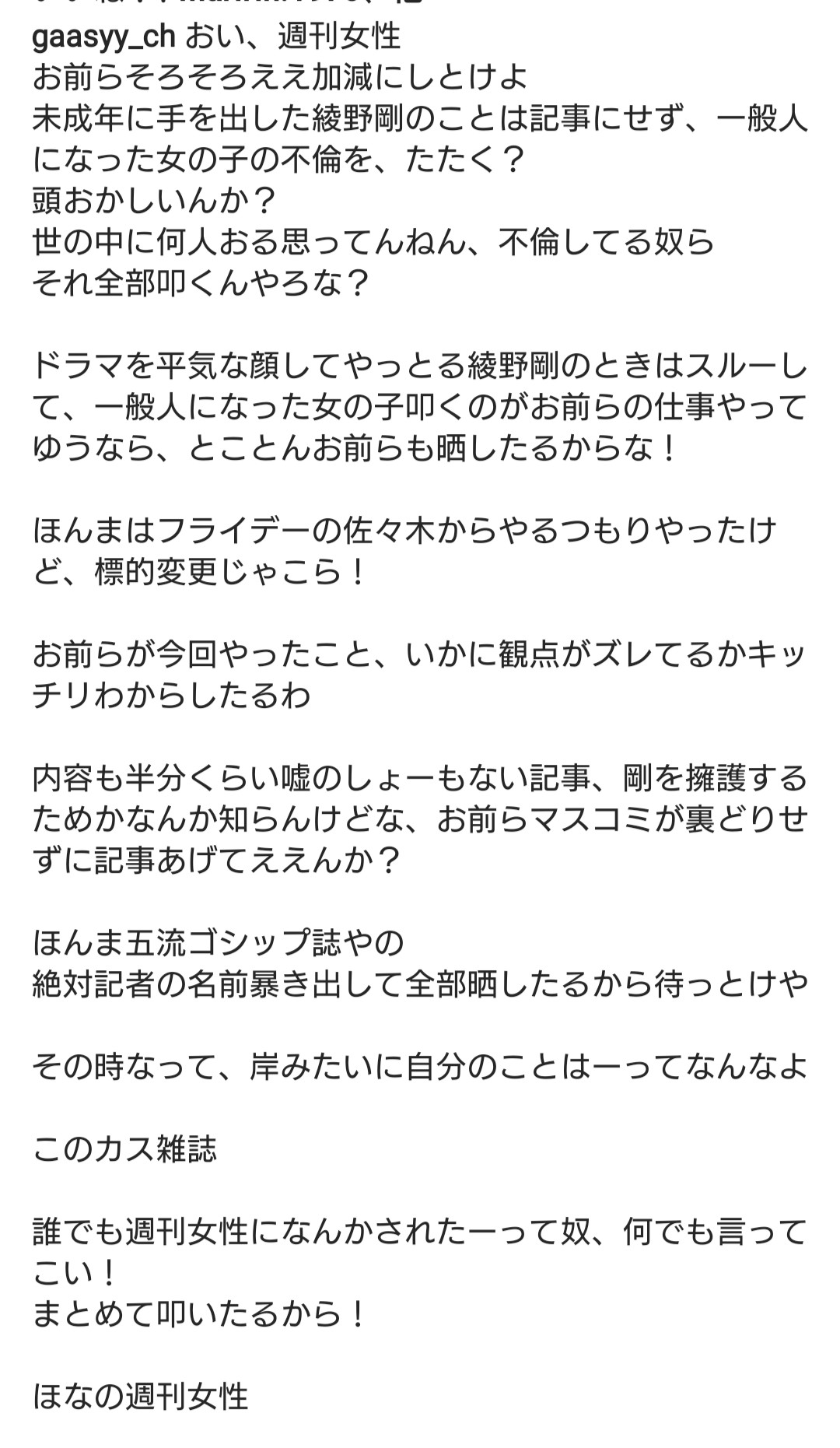 ドラマを平気な顔してやっとる綾野剛のときはスルーして、一般人になった女の子叩くのがお前らの仕事やってゆうなら、とことんお前らも晒したるからな!