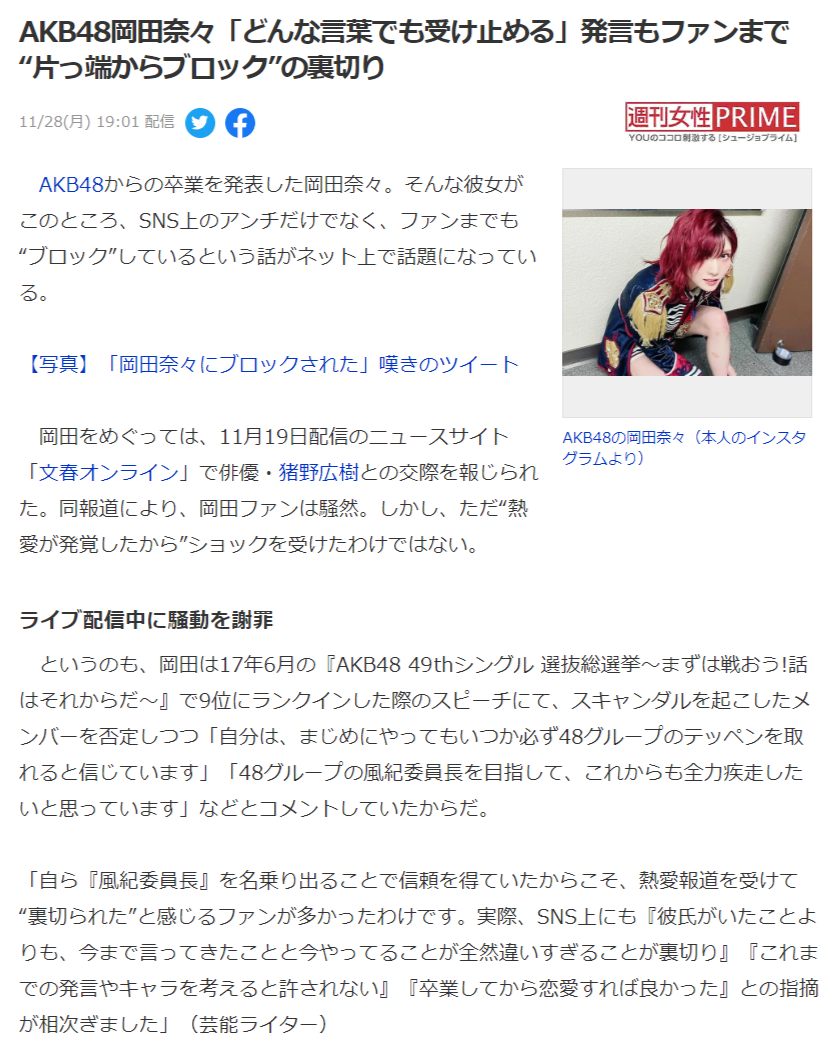 【週刊女性】AKB48岡田奈々「どんな言葉でも受け止める」発言もファンまで“片っ端からブロック”の裏切り