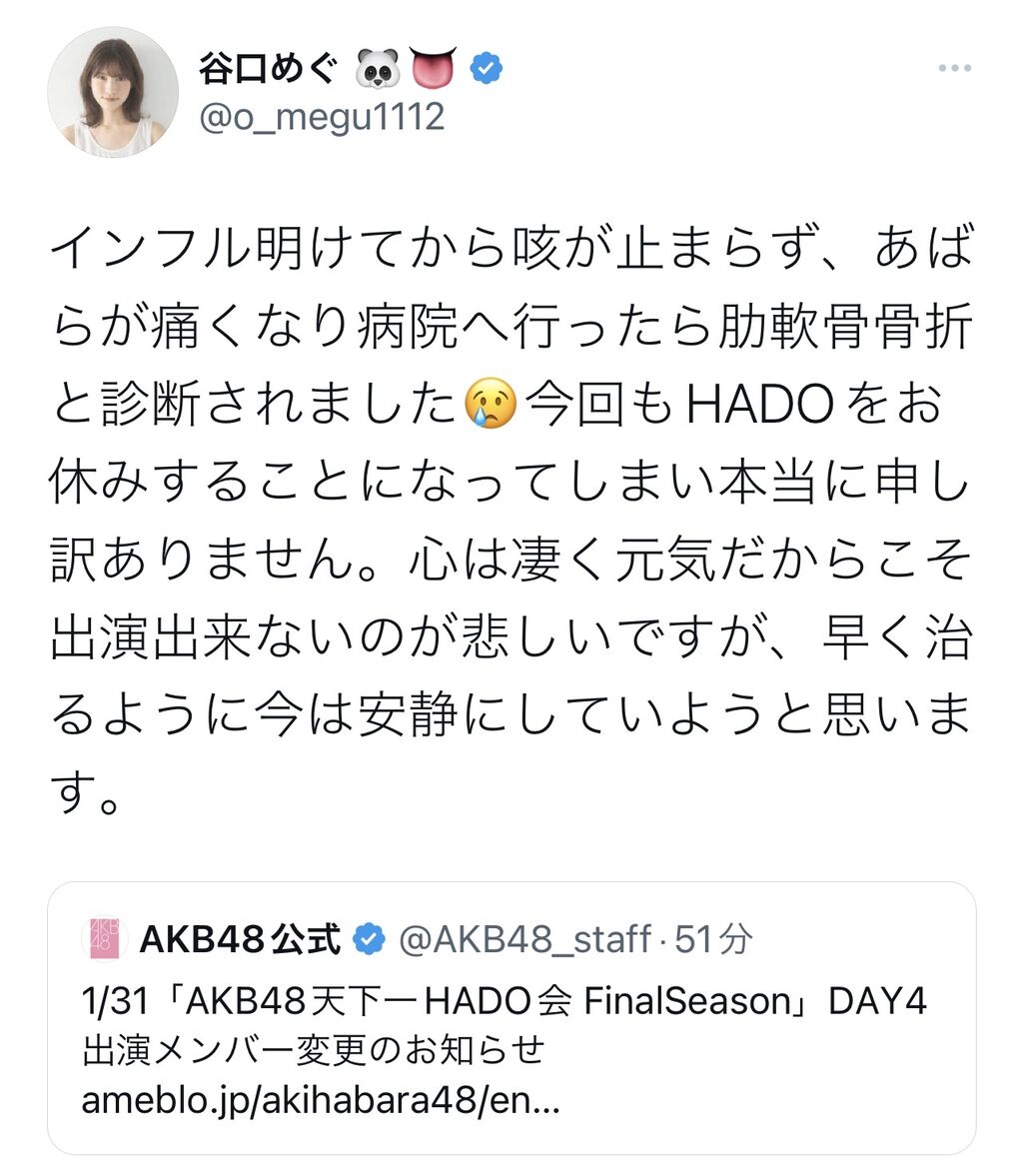 【悲報】谷口めぐさん、肋軟骨骨折