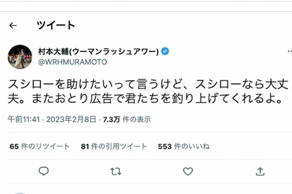 村本は《「償っていくしかない」スシロー “ペロペロ高校生” の実母謝罪に反応さまざま「真摯な親なのに」「徹底した追及を」》(『Smart FLASH』2月5日配信)の記事を引用するかたちで、備えつけの醤油の差し口や未使用の湯呑みを舐めまわして元の位置に戻したり、寿司のレーンに指につけた唾液を何度も擦りつける様子の動画が拡散された金髪の高校生を、上記のツイートで擁護してみせた。
