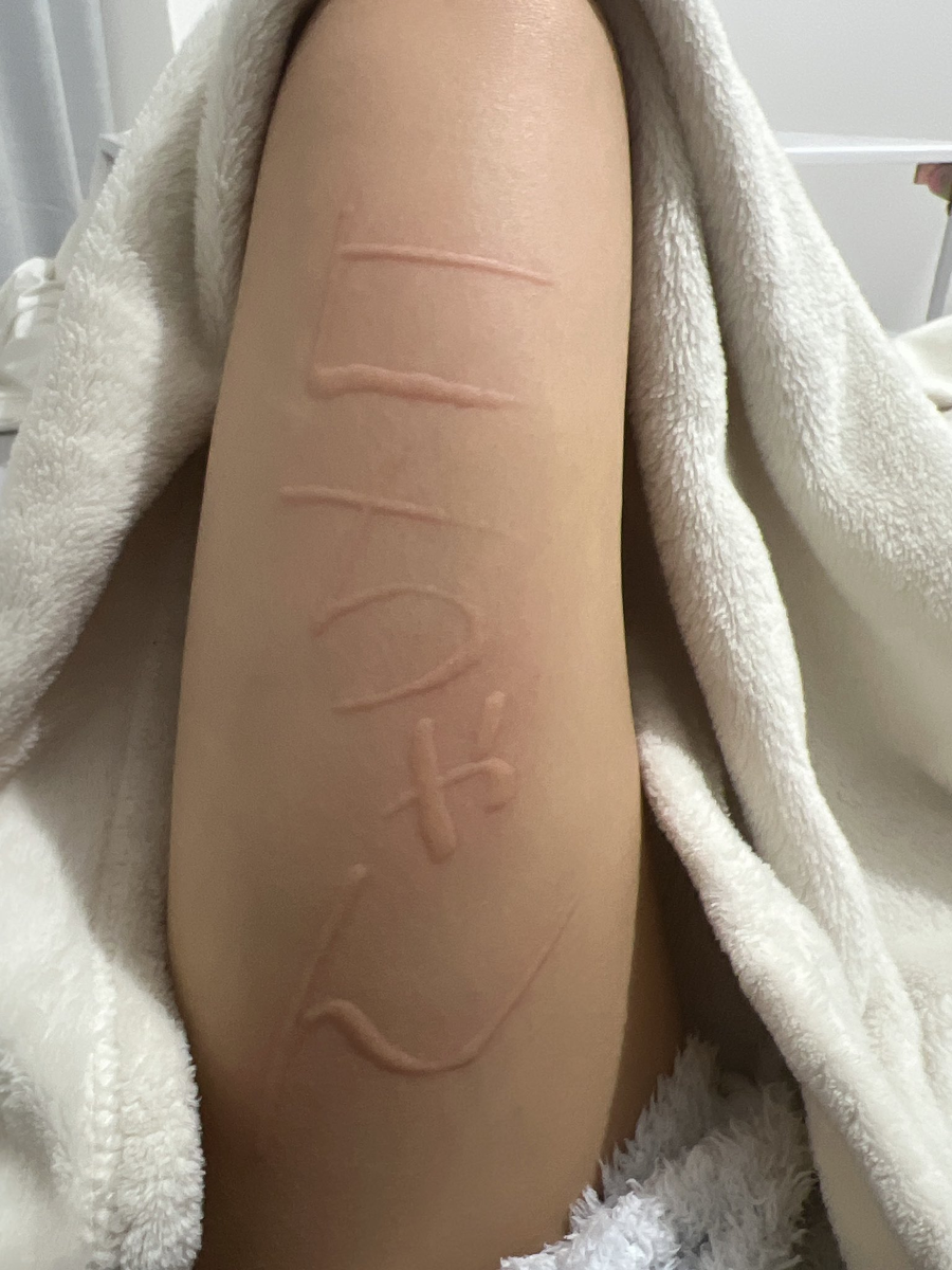 【画像】アイドルさん、皮膚を触ると蕁麻疹が出るからと太ももをなぞって文字を書いてしまう