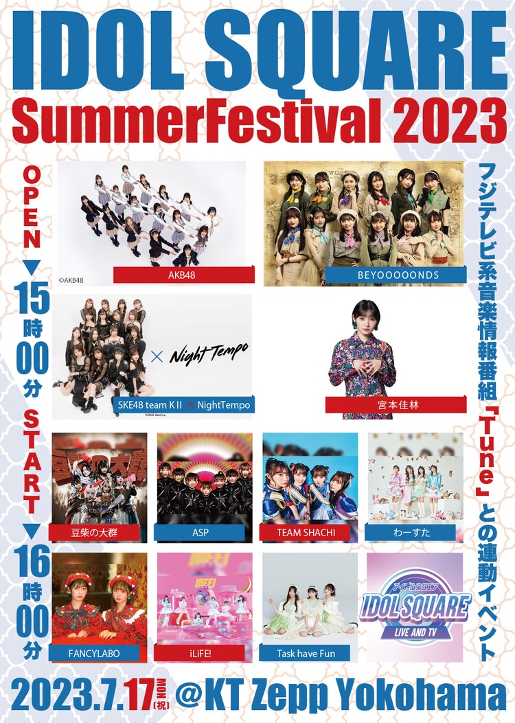 フジテレビ系音楽情報番組「Tune」と連動したライブイベント『IDOL SQUARE Summer Festival 2023』が、7 月17 日(月・祝)にKT Zepp Yokohama で開催します!