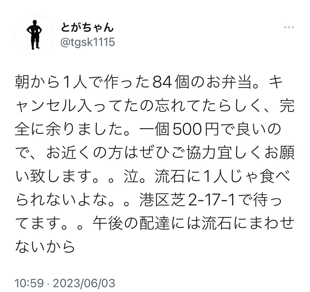 戸賀崎さん、弁当を84個もキャンセルされてしまい助けを求める