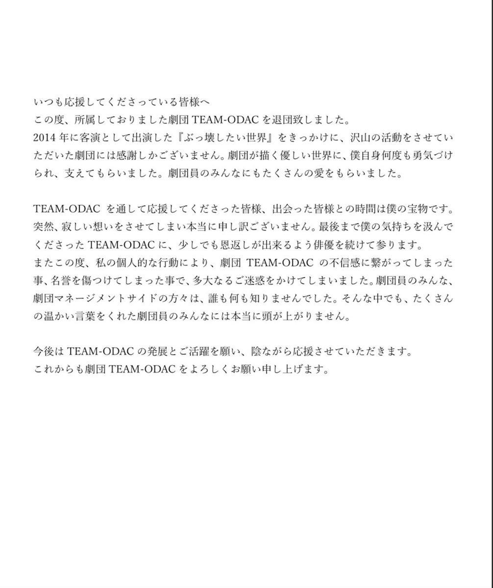 清水麻璃亜と交際疑惑の俳優・高品雄基さん、劇団を退団