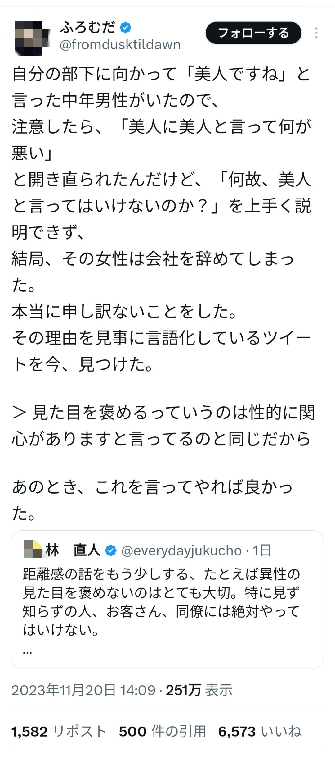 経営者「異性の見た目を褒めてはいけない。なぜかというとそれはあなたに性的に関心がありますと言っているのと同じだから」