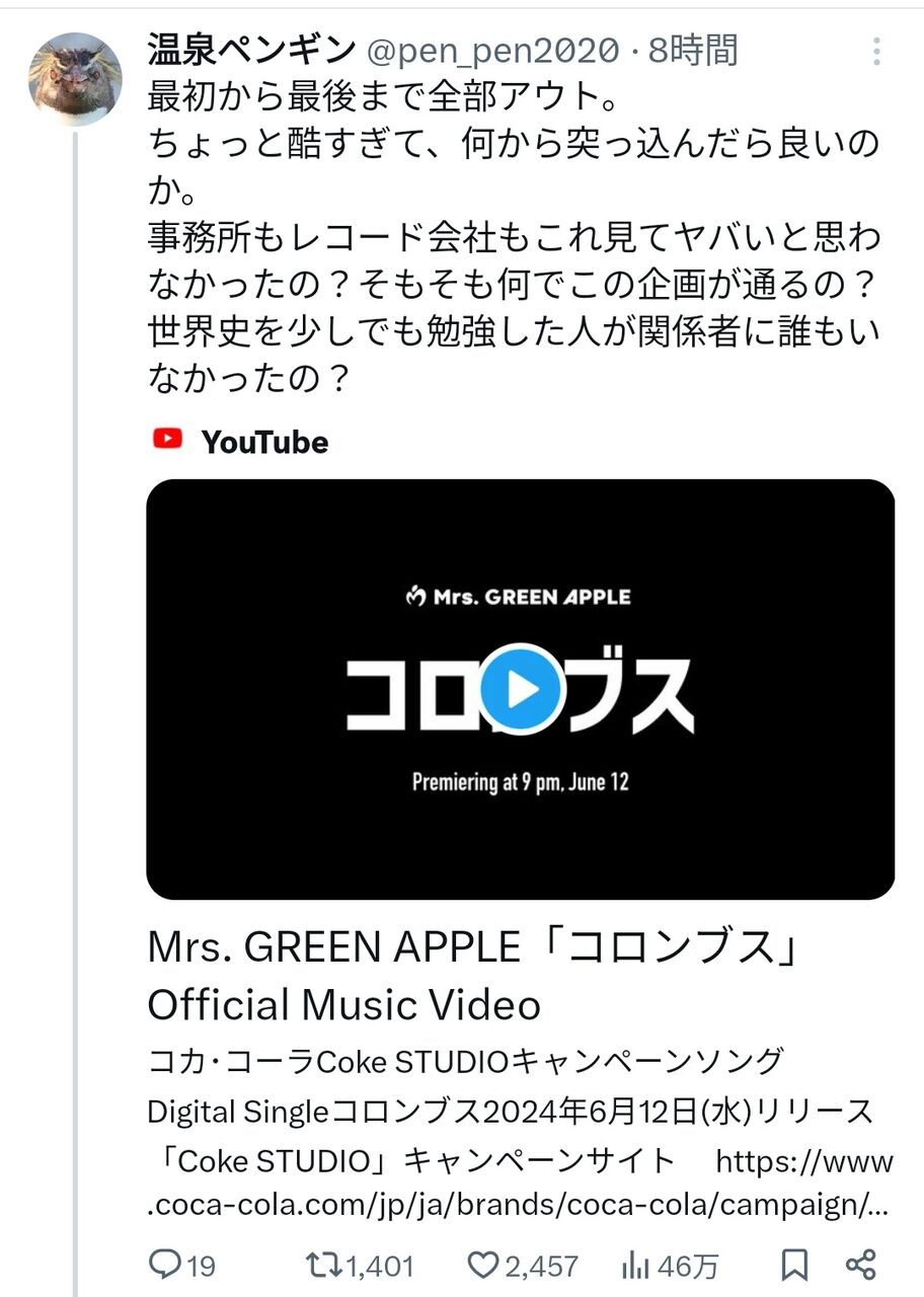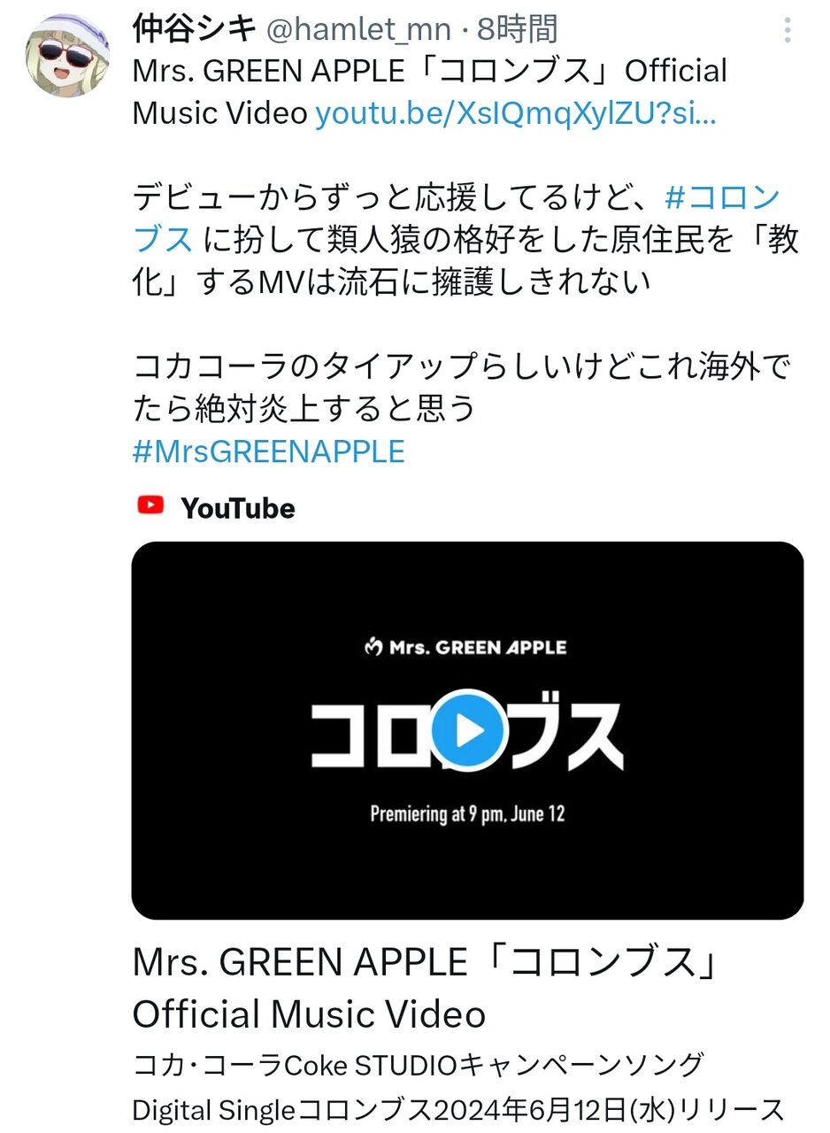 【炎上】Mrs.GREEN APPLEの新曲MV、猿のコスプレをした先住民族をコロンブスが支配する →炎上 →MV非公開