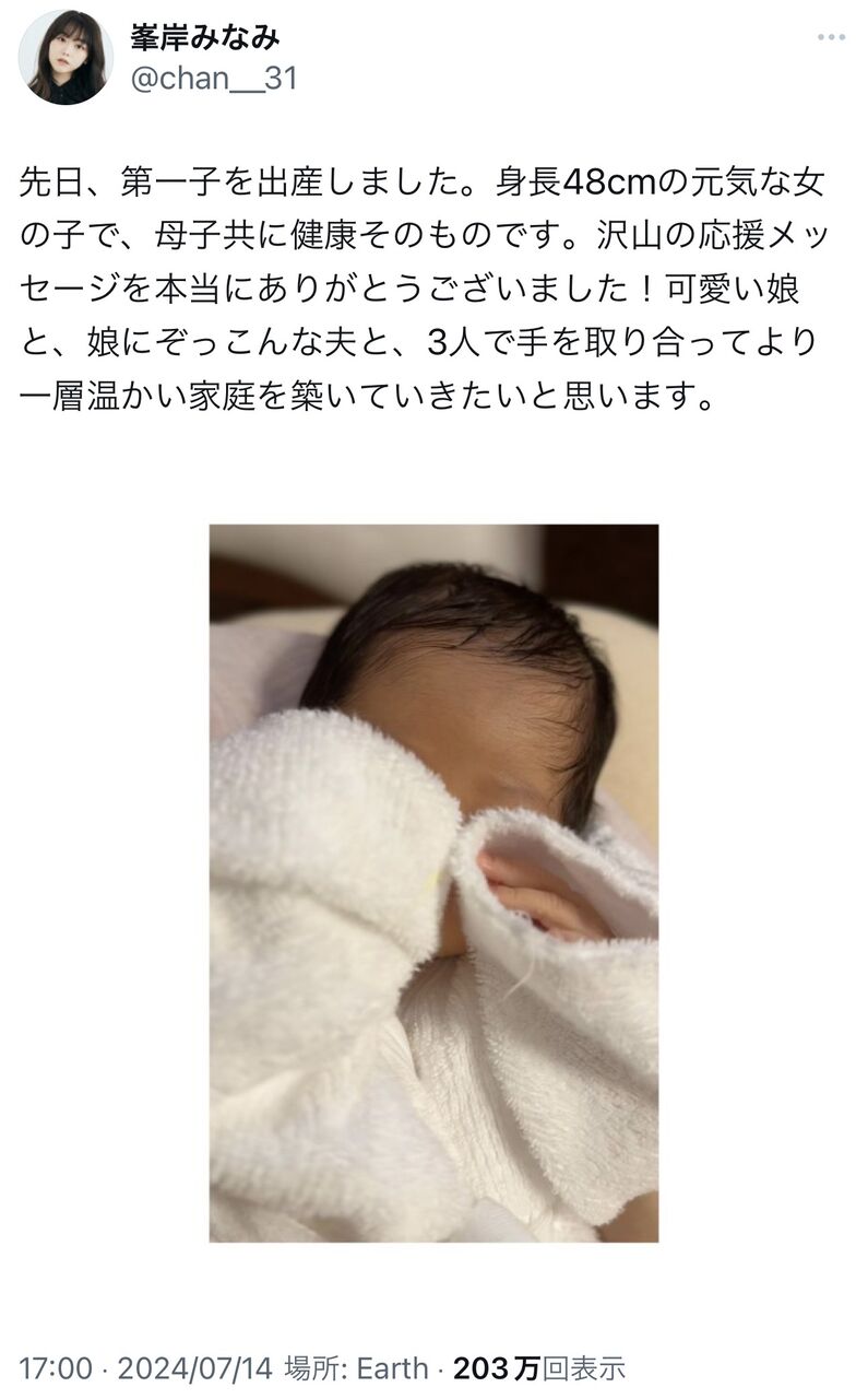 【祝】峯岸みなみさん、身長48cmの元気な女の子を出産