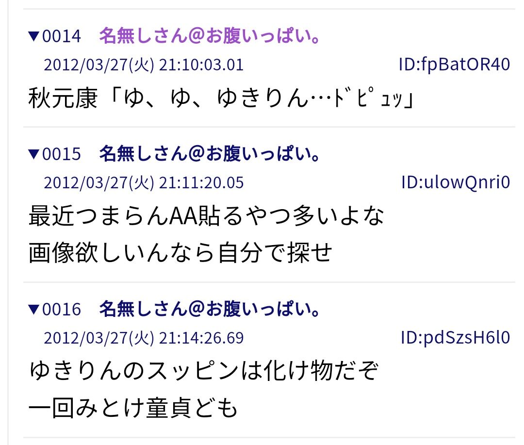 「ゆ、ゆ、ゆきりん…ドピュッ」これ10年前の書き込み