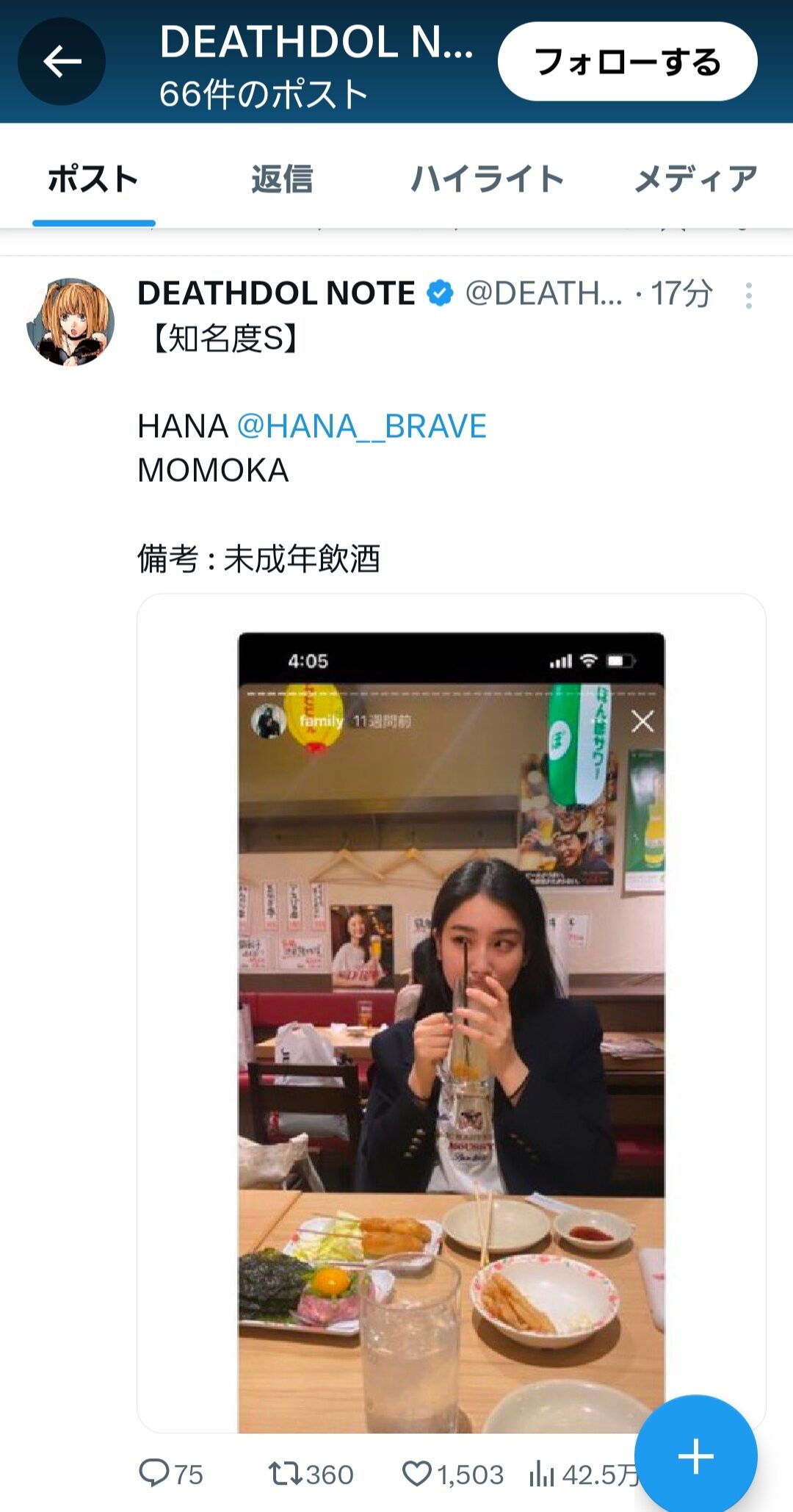 「DEATHDOL NOTE」さん、また有名アイドルの未成年飲酒を摘発
