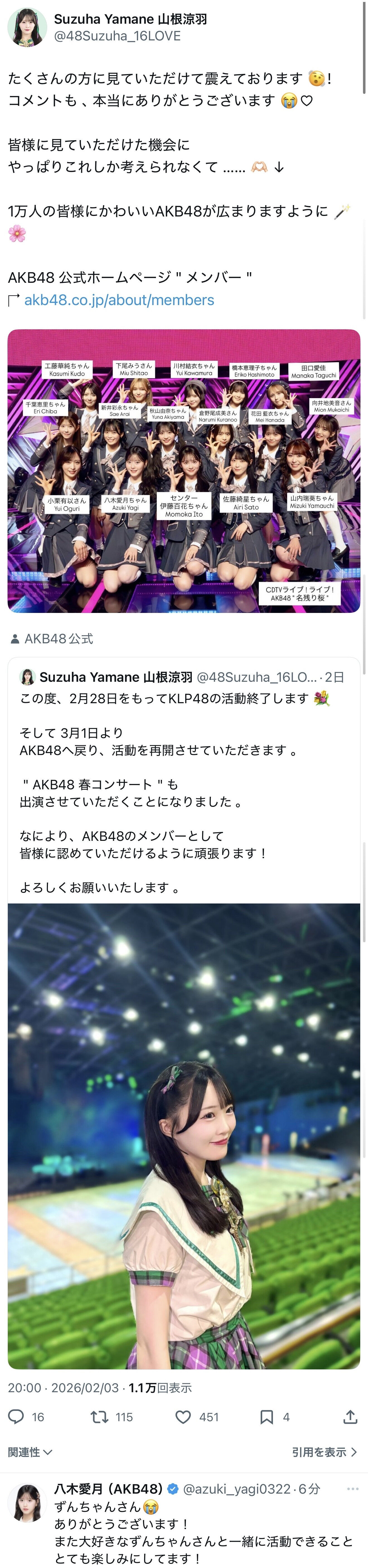 【速報】行天優莉奈・黒須遥香・山根涼羽がKLP48の活動終了! AKB48に復帰!