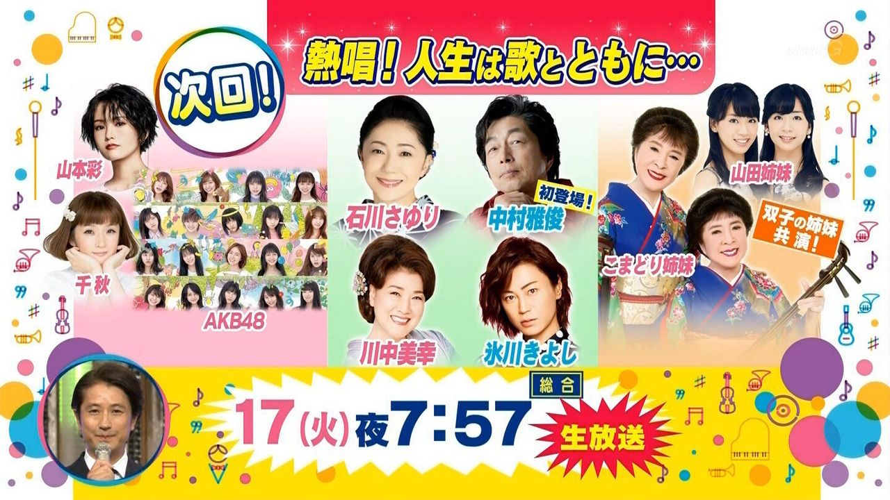 AKB48,川中美幸,こまどり姉妹,千秋,氷川きよし,中村雅俊,山田姉妹,山本彩,フラッシュ金子,MUSIC CONCERTO,【司会】谷原章介,小郷知子