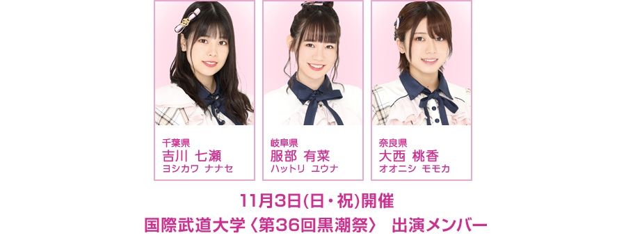 11月3日(日・祝)、国際武道大学〈第36回黒潮祭〉に吉川七瀬、服部有菜、大西桃香の出演が決定!11月3日(日)、国際武道大学で開催される〈第36回黒潮祭〉に、AKB48チーム8 吉川七瀬、服部有菜、大西桃香の3名が出演し、ステージイベントを盛り上げます!
